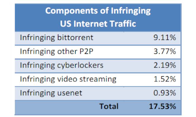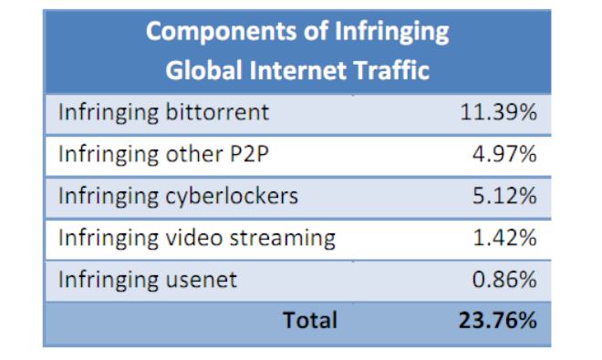 Según el informe, casi una cuarta parte del tráfico de Internet (23,76%) infringe de alguna manera los derechos de autor, siendo BitTorrent, la red de peer-to-peer (P2P) más popular de los últimos años, la que maneja el 11,4% de este contenido. Por su parte, los cyberlockers (sitios para almacenamiento de archivos) alcanzan el 5,1%; los sitios de streaming de video (como MegaVideo y Novamov) representan el 1,4%; y otras redes peer-to-peer (P2P) como eDonkey y Gnutella y sitios para compartir archivos como Usenet son responsables del resto del tráfico.